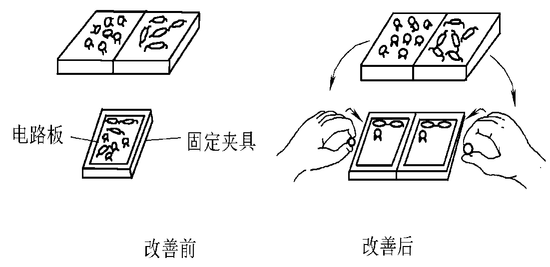 减少动作数量 | 1.消除不必要动作 | 1.将材料或工装夹具放在操作人员前方的一定位置 | 1.利用易取材料或元件的容器或器具 |