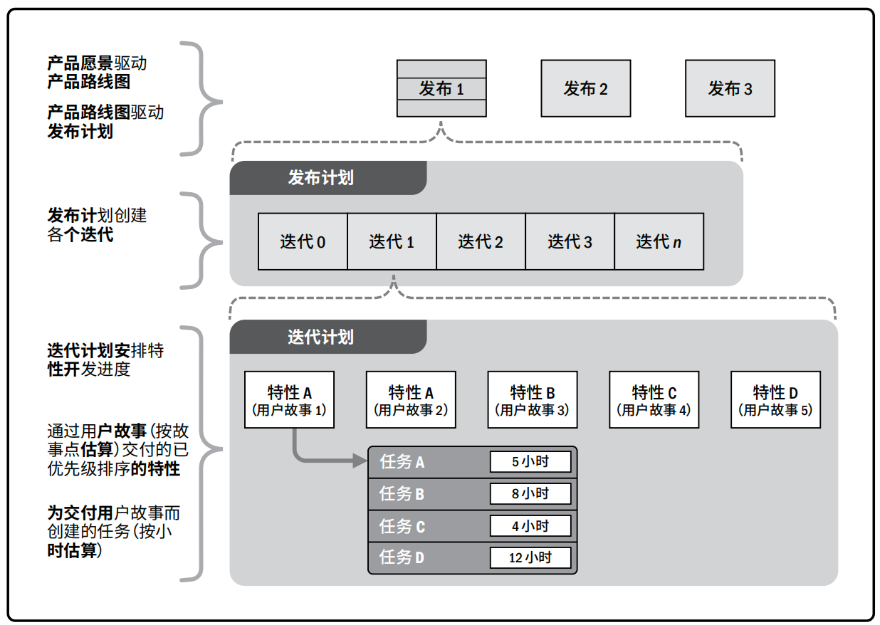 适应型进度规划会采用增量规划的形式,基于价值路线路制订计划,包括产品愿景、产品路线图、发布计划和迭代计划。发布计划是价值路线图的第三阶段,为团队提供了一个中期目标。一个发布是多个迭代集中交付工作的一个成果,这常常是对市场、业务和客户产生影响的标志性的时刻。制订发布计划一般有四个步骤: