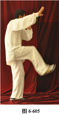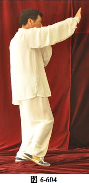 接上式,腰微拱,向右后旋转,身体随之右转,带左脚提起, 向右前方迈步,脚跟着地,脚尖内转,身体转向西南;腰微含继续旋转,身体转向西北。右脚跟向里稍转,脚尖朝向西北。同时左臂外旋内收至左肋旁,掌心朝上;右手向右后划一大弧,回至胸前,掌心向下;腰上提,提左膝向左前上方迈步,左掌向左前方穿掌,掌心朝上指向西北,右手臂贴近左肘下。腰微拱,向右转,身体随之后移,重心移于右腿。左脚尖向里内转,朝向东北,身体转朝向东北;左手臂随身体右转,划弧回拉至右耳侧旁。右手回拉至左腹侧;腰微向左回转,身随之回转,重心回移左腿;腰下沉,左腿屈膝坐实,右脚掌着地,微屈膝,成右虚步;腰自左向右上旋转,身体随之向右平移,右掌移于身体右前方, 左掌移于右腕里侧, 稍低于右掌, 眼随转体平视转移,观及两掌右移。右脚自左向右上方弧形外摆, 膝部自然微屈,脚抬摆不超过腰部,脚背略侧朝向右面。同时左手上抬,两掌自右向左迎着右脚面虚拍打, 先左手后右手。眼神观视两掌拍打右脚面(见图6-601至6-605)。