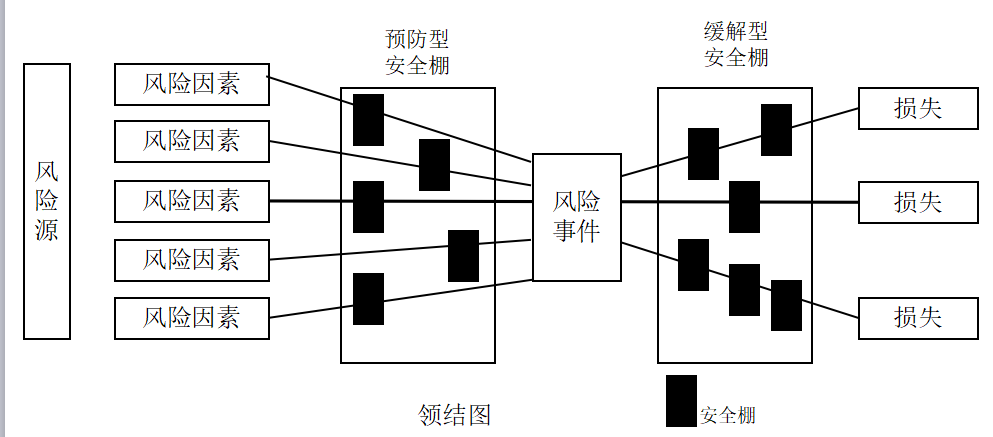 这种方法是保护层分析概念的一种拓展。它的特点是将事故预防的措施与后果减轻的措施分别列出在事故后果的左右两侧,形成一个类似“领结”状的分析图表,因此得此名。在领结图中,将危险和初始事件布置在事故后果的左侧,而将残余影响布置在最右侧。在初始事件与事故后果之间是阻止具体事件的关联线及事故预防的措施,在事故后果与残余影响之间则是后果减缓的措施。这种方法适用于较成熟的工艺系统。