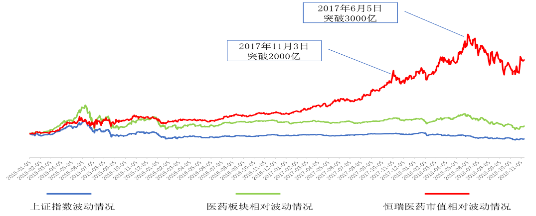 图2-31恒瑞医药2015年至2018年市值与上证指数和医药板块整体市值变化情况