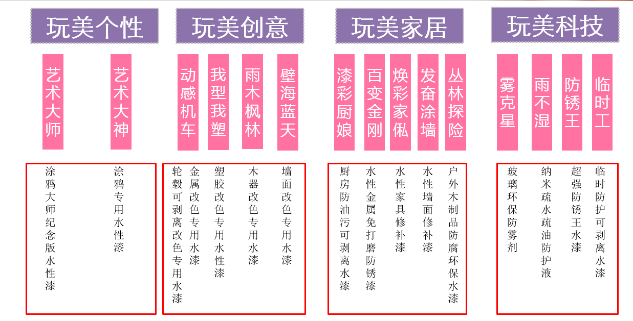 确立了品牌定位之后,我们需要强大的品牌背书支撑。31年专注涂料领域+首个自喷漆科研中心+水性环保材料+涂鸦大赛合作方+涂鸦大师,五位一体,凸显迪确美品牌底蕴深厚、技术专业、材质环保、极具创意的特点,与其他自喷漆形成明显差异化。