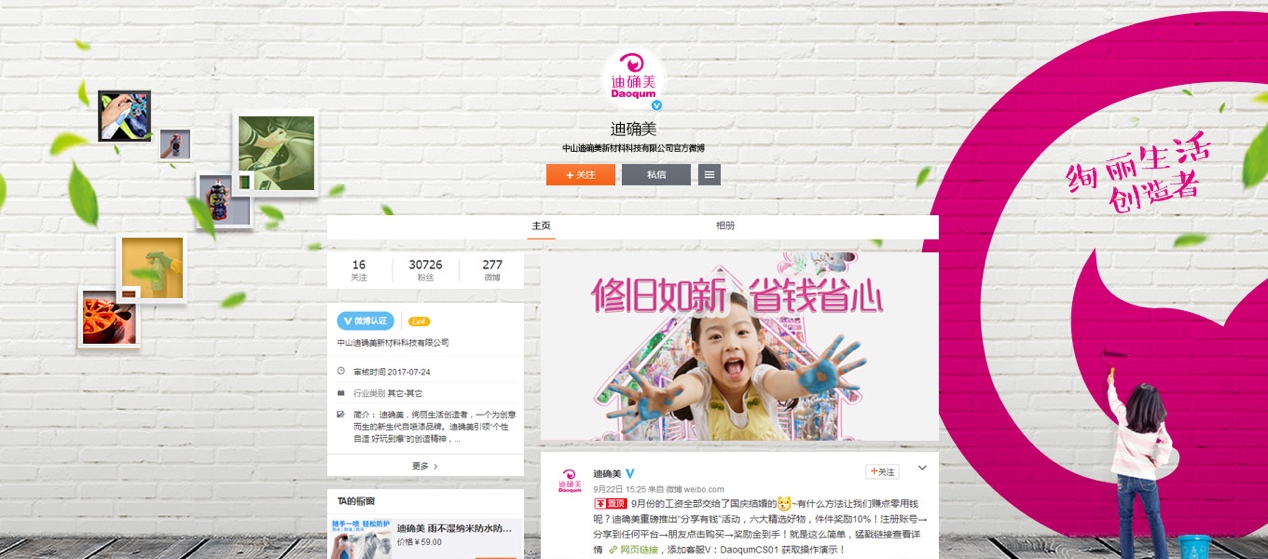 在调性上,迪确美代表着创意、好玩,与环保的创意涂鸦及家居喷绘产品,那么迪确美双微平台对应的是让人感到创意、好玩与环保的品牌价值;迪确美的品牌定位是绚丽生活创造者,讲究激情、个性突出、娱乐化的生活态度,那么平台对应的是绚丽生活空间。