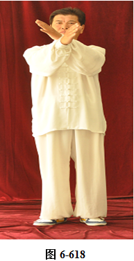 接之式,腰后拱,成后倚坐式,重心渐渐移至右腿上,左脚内转,脚尖朝向正南,身体亦转向正南;左腰上提,重心随即转向左腿上;右腰向右上提,随即右腿向右外上方开步,两臂随之外旋向两侧打开,与肩平行,两手心向下;左腰向右上提,重心随之渐渐移向右腿,两臂随之下垂,左臂置于左膝外侧,右臂落至与右膝垂直;左腰微提,左臂与左腿同时向右并拢,成蹲式。左右两臂交叉, 左手臂在上,两手心向下;腰上提,身体直立,两臂随身体直立, 呈十字,两掌翻转,手心朝外,眼神平视。(见图6-615至6-618)
