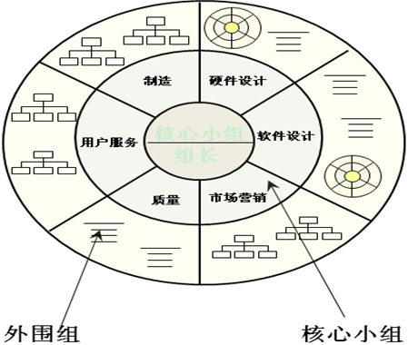 核心小组通常由5~8个具有不同领域的成员及一个核心小组组长组成(新产品开发项目经理),它并不采用传统的分级管理办法。所有新产品开发责任都分配到各个代表身上,每个代表的职责通常与其领域能力相关。核心小组的结构应用一个不间断的圆形结构图来表示。