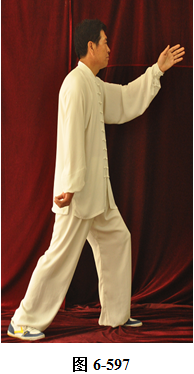 接上式,腰向右外上提,身体右转侧向西南并稍前俯,右脚脚尖外开,朝向西南,重心移至右腿,右腿屈膝下蹲。左手随前臂外旋,向右上划弧绕转至右肩前,手指向正西,左腿伸直,向左外转脚跟。右勾手臂随转体,朝向西南;腰向后旋拱回转,身体向左回转,左脚尖向左外转朝向正东。右脚尖向里转,朝向正东。左手臂随身体渐向下向左回转,下落经裆前沿左腿内侧,向前上方划弧穿伸,指尖朝前上方,掌心向右。右勾手向回后划弧,落至右胯侧, 勾手尖朝上。左腿屈膝前弓,右腿渐渐蹬展(见图6-596至6-597)。