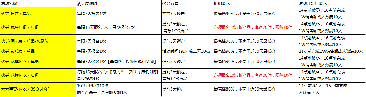 3)伙拼的类型包括:伙拼单品团【只能报名单个商品的活动】、疯狂店促(厂商直供)【最少4~12款商品,其中至少1款是3折商品】、天天特卖【针对尾货、断码、临期、滞销、库存产品等货品打造的活动专场】、周末惠【只能报名单个商品的活动】、夜总惠【只能报名单个商品的活动】、行业类目特色活动(例:内衣行业-花样内衣等)、官方大促伙拼活动(例:531伙拼5周年庆等)