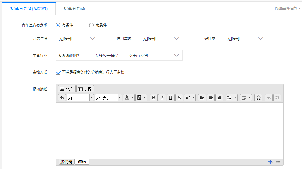 3)发布招商信息。路径:我的阿里——1688卖家工作台——分销——发布招商信息。如图9-23所示,请注意:一定要认真填写框架内的招商信息,涉及客户的档次及范围等,比如合作是否有要求、开店年限、信用等级(建议看一下设置信用比较高的客户)、好评率当然越高越好、说明这个客户的买货“素质”、分销行业可以多选,选择和自己相关的行业;招商描述需要点文案技巧,最好找个文案能力比较强的人编写,编写时参照详情页。技巧:短句子、多分段、重点内容加大加粗,把自己的实力重点展示出来。做这些并不是给自己看的,而是展示给想做代理的买家看的,争取新买家入驻。