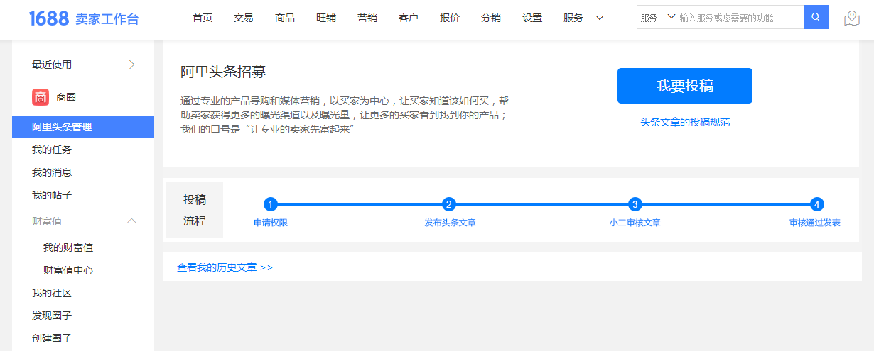 1)如何成为阿里头条作者?路径:我的阿里——卖家工作台——搜索——商圈。会出现一个申请的对话框,点击申请成为头条作者就可以投稿了。如图9-33所示。