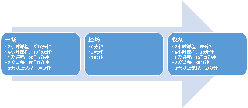 开场时间:2小时课程控制在5~10分钟;4小时课程控制在10~30分钟;1天课程控制在30~45分钟;2天课程控制在60~90分钟;3天以上课程控制在90分钟。
