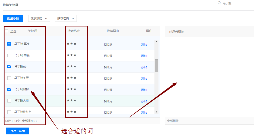 如果觉得这些词还是不满意,那么我们可以再选择。点击旁边的搜索框,然后输入关键词,如“马丁靴”,就会出现很多和马丁靴相关的词。建议选择热都高的词,至少是热度为3的词去做,不然没多大作用。同时,在下面的词中会有一些不相关的词,我们要选合适的词,然后点击保存并继续,我们看图11-20所示。