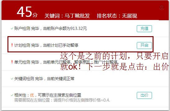 以前可能做过的计划,但是做着做着就没排名了,怎么办?这就需要及时调整自己的计划,依据系统判断的相关性及参考价格来继续做下一步调整。如果发现无展现的系统相关性好,就要及时调整价格。