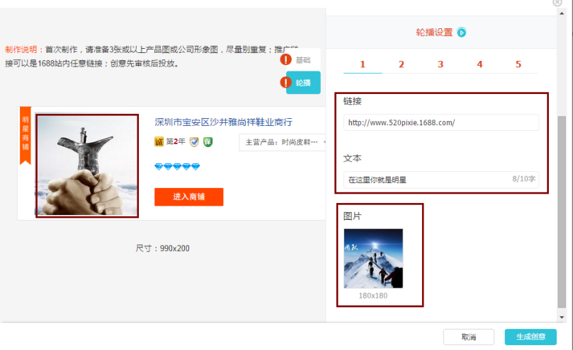 第三步,选择创意。主要是选择创意图的尺寸大小,图片的大小要自己去设计,阿里巴巴会根据你选择的位置来自动设置生成。可以选择的尺寸为:220×300像素、300×250像素、950×90像素、186×275像素、600×150像素、336×280像素、270×368像素。知道了这些,接下来就要添加创意了。