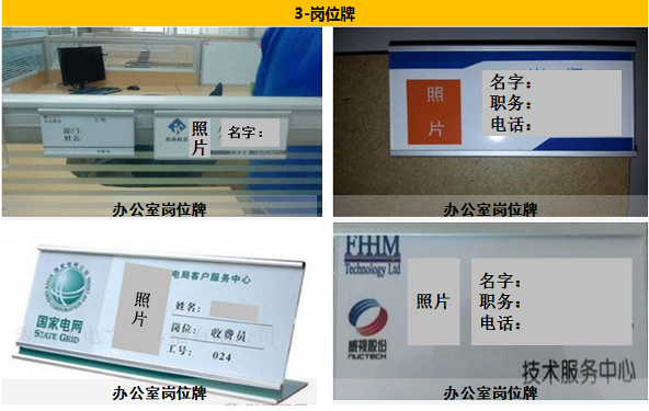 位置:张贴在办公桌左边或者右边,统一位置。材料:塑料、PVC材质、铝合金等材质。尺寸:宽5~15cm,长10~30cm。颜色:根据企业文化、厂内颜色或行业标准颜色自定义。