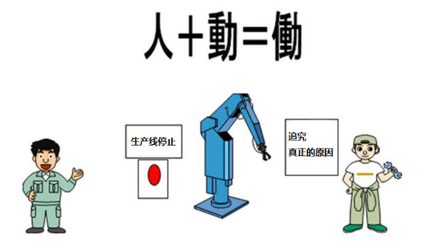 省人化 | 将人和机械的工作分开 安东原理 再发防止 | 不做设备看守人,使设备像人一样工作的思路,即使异常发生,因为机械可以自动停止,不必有人守在旁边监视机械,提高作业效率 可在设备运转时等待的时间里去做其它工序的工作,从而实现“省人化” |
