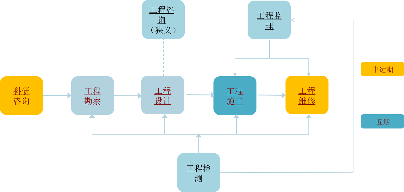 目前P公司主要聚焦在“工程施工”环节,对“工程维护”环节重视不够;但是,随着时间的推移,公司完成的部分项目已经进入维护阶段,因此公司应该“施工”与“维护”并重,并逐渐往上游咨询、设计关键领域延伸。随着价值链环节发生变化,P公司的商业形态也发生了变化。P公司近期和中远期价值链环节对比如图12-5所示。