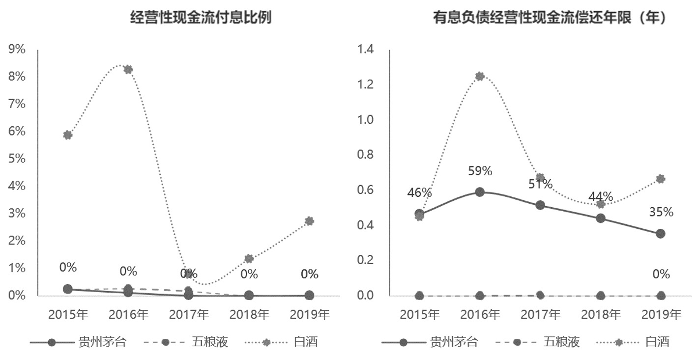 图8-19显示了贵州茅台、五粮液、白酒行业在2015—2019年的经营性现金流付息比例和有息负债经营性现金流偿还年限。