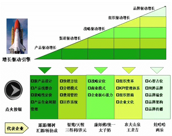 当然最高的一点,真正的大成,除了组织驱动外,还需要有品牌驱动。因为品牌才是一个企业真正最核心的资产,尤其是对食品企业。产品的形态是千变万化的,品类的发展也是千变万化的,但企业的品牌是不变的,而企业品牌的价值,企业能不能从过去的产品驱动、渠道驱动这些层面的驱动,最终转化成让它的品牌跟消费者建立一个牢固的关系,变成一个品牌驱动的企业,这才是中国食品企业要获得百年基业或者未来30年、50年发展最核心的因素。