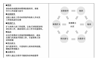 中小银行应丰富人才培养的方式,加大人才培养的力度与投入,针对人才评价的结果选择针对性的个人培养手段。具体而言,可采用的培养方式包括培训、在职学习、职责扩大、轮岗、项目参与和自我学习等。如图9-28所示。