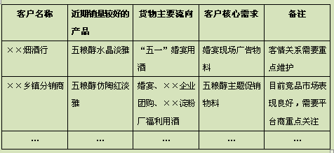 建立“淡季重点关注客户档案表”的主要目的是将商家的主要精力和资源重点投放在重点客户和重点市场,笔者建议选择10%的有效终端店作为重点店关注,选择10%的分销客户作为重点客户关注,由商家老板或者总经理亲自筛选和选定(在白酒销售淡季,客户一定要放下身段,深入一线市场,每天听业务员汇报,你不一定了解市场)。
