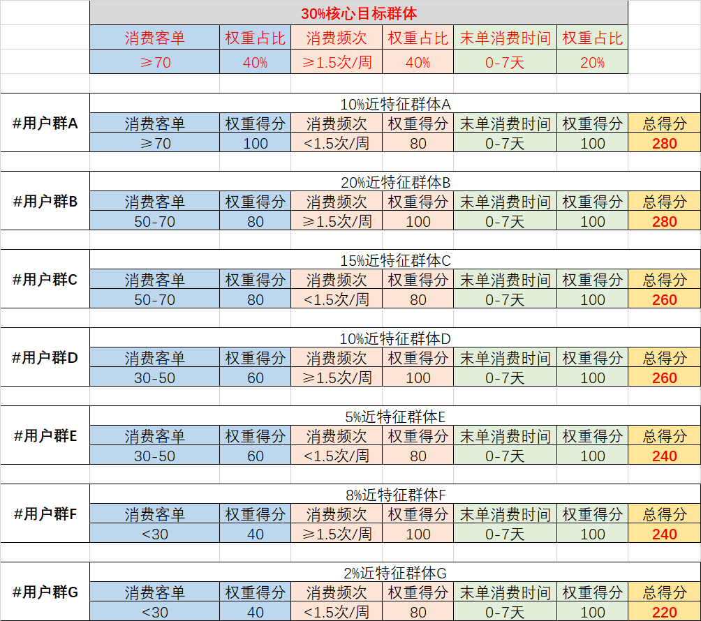 实操过程:我们将目标30%的用户画像用消费客单、消费频率、消费末单时间(RFM模型)进行拆分,拆分的过程中我们将3个维度都按权重占比划分。我们开始对70%用户同样按照这3个维度拆分并注意比对并打分评级。如表1-7所示。