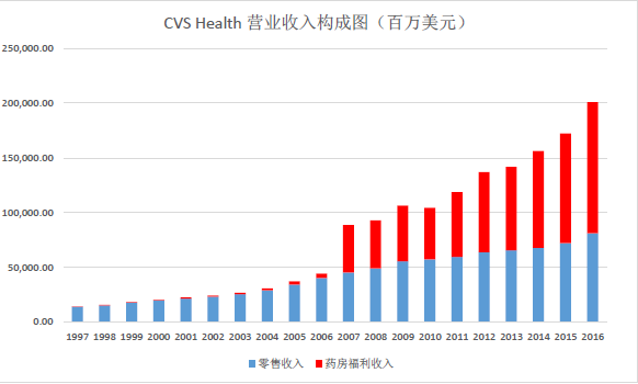 CVS Health从1994年开始重新设定战略性的发展规划,这个转型战略是打造一个以线下零售网络为基础,以药店福利管理(PBM)为动力的“双核心”发展策略。对于CVS Health而言,线下门店的布局是整个集团业务的基础,而PBM业务则是推动集团业务快速发展的原动力。通过大力投入PBM业务,整个CVS Health的业务线由传统的药品零售带动的业务增长转型为由“药店福利管理+药品零售”双驱动带动集团业务增长。