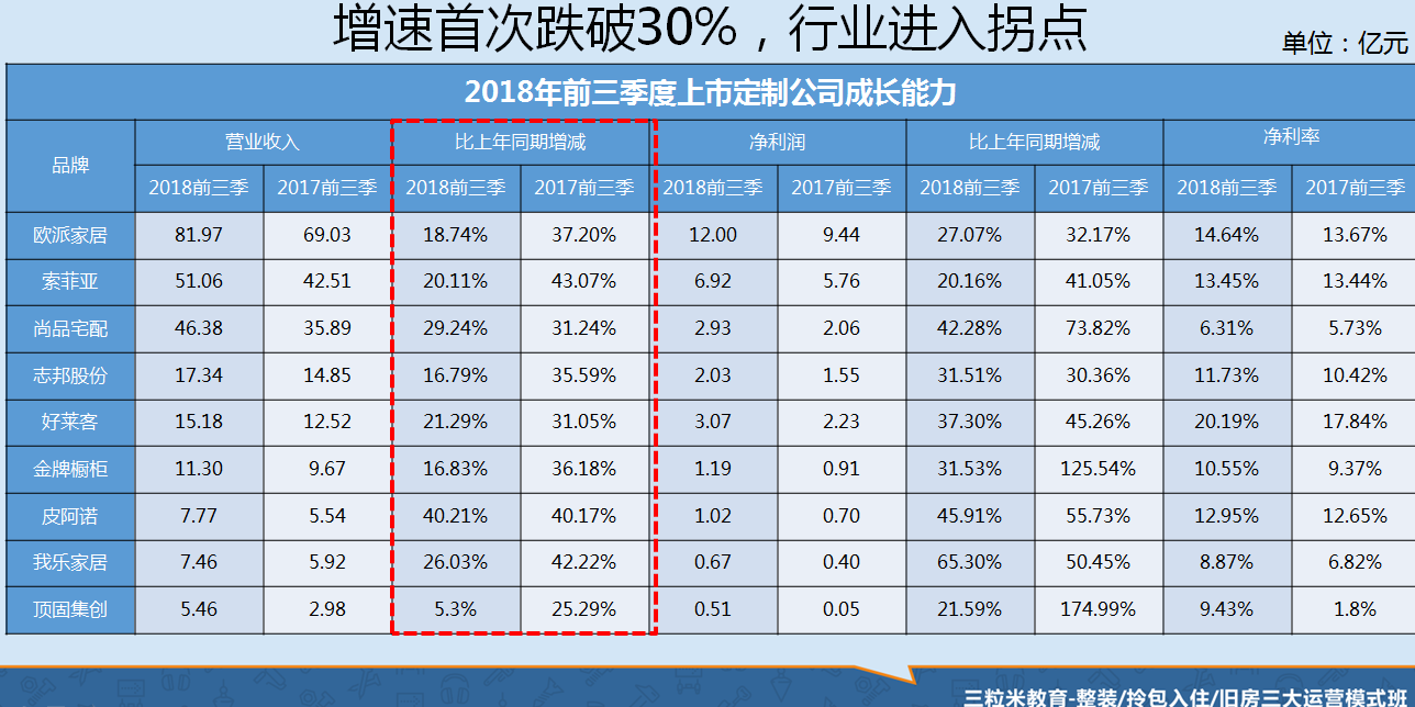 2、整体增长放缓。2018年来,家居行业整体增速放缓已是公认的事实。受大环境影响,定制家居经历了去年集体上市的小高潮之后,也从一路高速狂奔转为现在的平稳增长。定制家居30%以上的高速增长时代正式宣告结束,进入10%-20%增长的新常态。