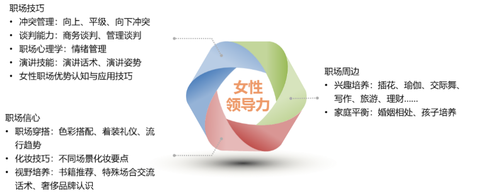 职场周边培训是打破女性只有家庭和工作的模式,培养一项专属兴趣,可以让女性干部更有魅力。女性领导力训练营在兴趣培养上有两个目标:一是带女性干部入门兴趣;二是组建兴趣小组,让一时的兴起转变为真正的兴趣。对于精英职场女性,插花、瑜伽、交际舞、写作、旅游、理财等不仅仅是建立个人的兴趣,也对工作人际关系和个人身体健康有益处。职场女性的大部分时间还是离不开工作、生活及两者之间的不断平衡。而职场女精英在这些方面往往有独特的处理方式可以作为经验分享,比如分工计划、干预界限的约定和执行。分工计划是指在孩子教育的分工上,提前约定夫妻双方及老人之间的分工,然后相信彼此、勇敢放手。不管在生活中还是工作中,“既要又要还要”的权利和资源过分掠夺方式都会给合作的彼此之间产生更多矛盾。