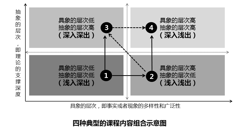 我们可以依照“横坐标”(具象的层次,即事实或者现象的多样性和广泛程度)及“纵坐标”(抽象的层次,即理论的支撑深度)两个维度的有效互动进行梳理和推进,最终形成四种典型的课程内容组合,即浅入深出、浅入浅出、深入深出、深入浅出(如图5-2所示)。
