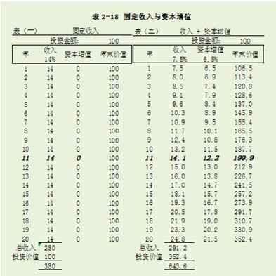 从表2-18的(表一)和(表二)来看,在前九年内,“固定收入”(定存、债券)投资所提供的收入,都比“固定收入与资本增值”(房地产、股票及基金)的投资组合要来得多,但是,从第11年开始,“固定收入与资本增值”投资组合的收入会每年增长,而“固定收入”的投资始终维持在14%的同时,资本的价值也保持不变。