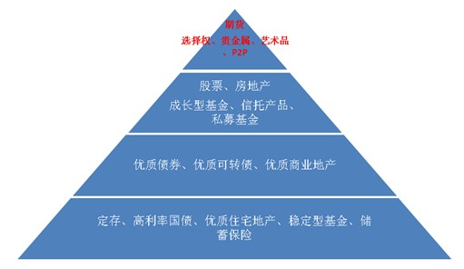 在投资时,了解投资金字塔的基本观念(见图2-12)相当重要,因为它可以协助我们面对投资风险。一般常用的理财工具可区分成不同的类型,如极保守型、保守型、风险型、适度风险型、极风险型。金字塔的底层往往也是比例最高的,它能够确保资金的安全,持有这些投资的主要目的有:紧急储备金、于一年内必须动用的资金、人身风险的规避等。从金字塔的第二层开始,风险便开始增加,因此,所投入的资金也应该相对减少。采用这样的投资组合,其优点是:在投资期间万一遭遇突发事件,或经济不景气而有损失时,你还能保存投资于金字塔底下数层,而且是对基本生活水平有重大影响的资金。投资理财的基础由金字塔的下方开始,然后逐渐往上,风险也逐渐向上递增。许多人往往将投资理财的基础建立在一个“倒立型”的金字塔,以这种形态的投资模式,往往在遭遇突发事件、经济不景气,或行情受到短暂影响时,会把大部分的资金亏掉。