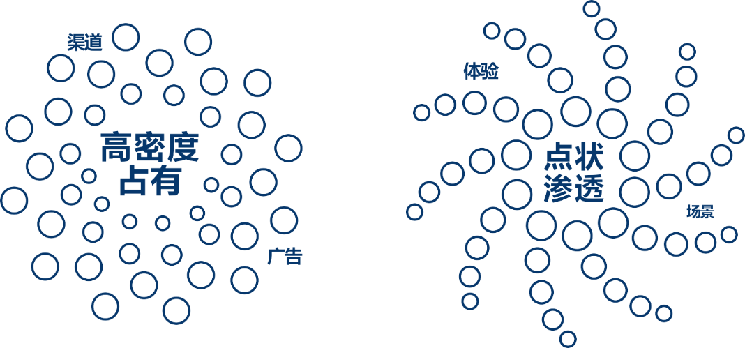 “高密度占有”形态的三板斧是:广告、渠道、低成本,适合立体需求的最大化占有。“点状渗透”则强调体验、场景、服务。