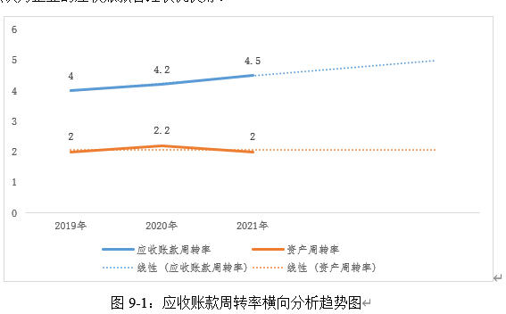 横向分析旨在探究应收账款周转率与资产周转率之间的关系。若应收账款周转率趋势高于资产周转率趋势,则表明企业的应收账款管理处于正常状态;反之,若应收账款周转率低于资产周转率,则表明企业在应收账款管理上存在不足。如图9-1所示,当应收账款周转率的横向分析趋势高于资产周转率时,可以认为企业的应收账款管理状况良好。