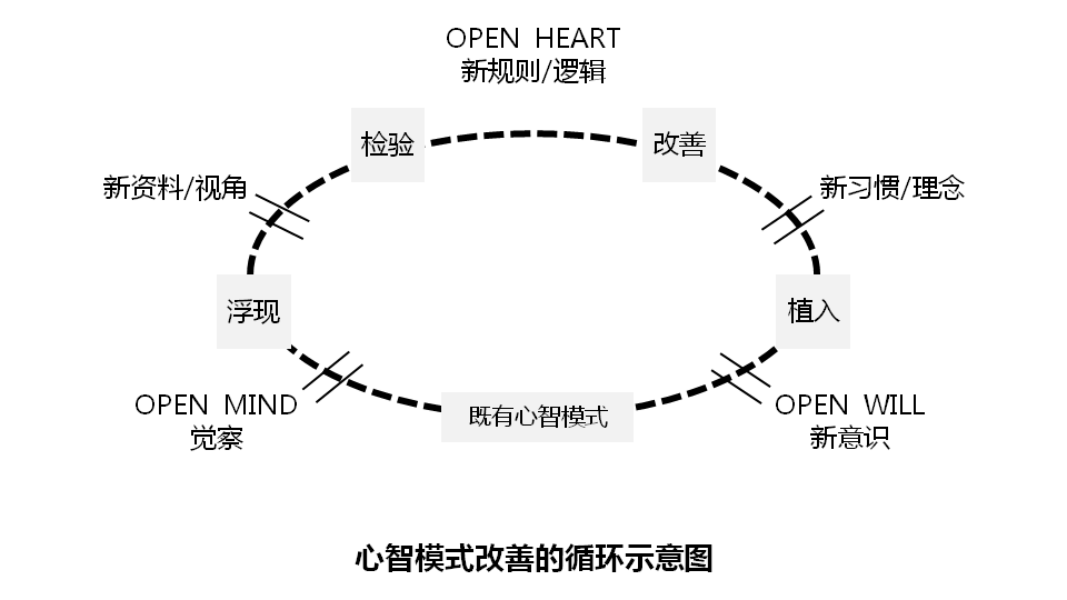 (3)改善——开放的心灵。在接纳了新的资料之后,人们需要用新的规则或逻辑对其进行解读,以便检验心智模式的有效性及其适用范围。由于思维的连续性,这一过程和检验几乎是同步发生的,是奥托 · 夏默所称的“开放的心灵(open heart)”。
