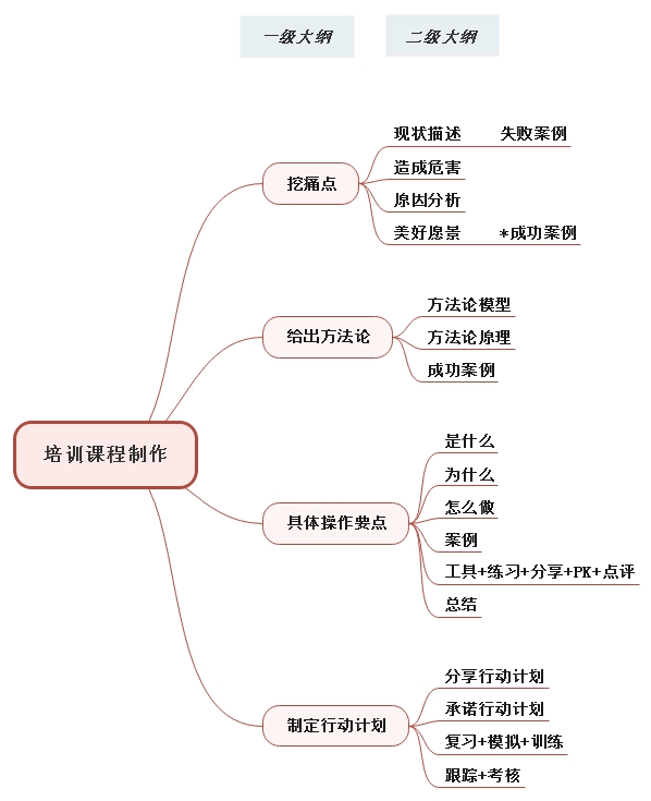 这就是我们培训课程设计的三级大纲逻辑图,先来看一级大纲,就是先挖出痛点,痛点其实就是经常发生的让我们难受的事、棘手的问题;然后给出方法论,也就是独到的解决办法;接下来讲具体操作的要点是什么;最后是实操的落地方案,制定行动计划。