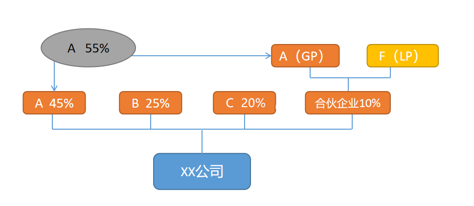 上图中的股权结构,就是利用了有限合伙企业,A从表面上看持股的股权只有45%,但他实际持有的表决权是55%。A作为有限合伙企业里的普通合伙人(执行事务合伙人),A在该合伙企业中的权利不以他持有多少合伙份额为主,因为《合伙企业法》规定,在合伙企业中只有执行事务合伙人能对外代表该合伙企业,其他有限合伙人是不能代表该合伙企业去行使权益的。因此在股权控制上,当创始人或者创始团队的股权被稀释的情况下,可以借用有限合伙企业作为持股平台,以达到控制权(表决权)的实质拥有问题。