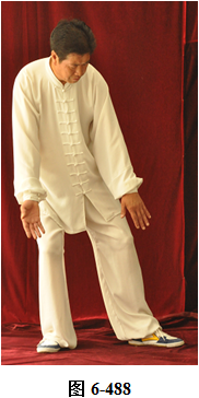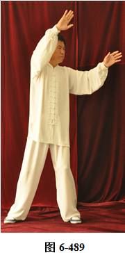 接上式,腰微拱上提,随即抽回右插掌,抬起左按掌向前送翻掌,掌心均朝上;松腰上提,重心移至左腿,右脚后跟微微抬起。随即腰微拱,旋转向右外,在向左里回转,右脚尖朝向正南;左脚提回,向左前上方迈出一步,脚尖朝向偏东南。同时,右掌由身体前上提,随提随着臂内旋转,掌心翻转朝外;左掌回收,翻转掌心向外成左侧弓步。同时两臂抽回,随身转体至右向左划大弧形掤出。五指朝左斜上指,掌心向外; 左掌与头平行,右掌略高于右额前成上托之式。眼神向左平视,观及左掌前托(见图6-487至6-489)。