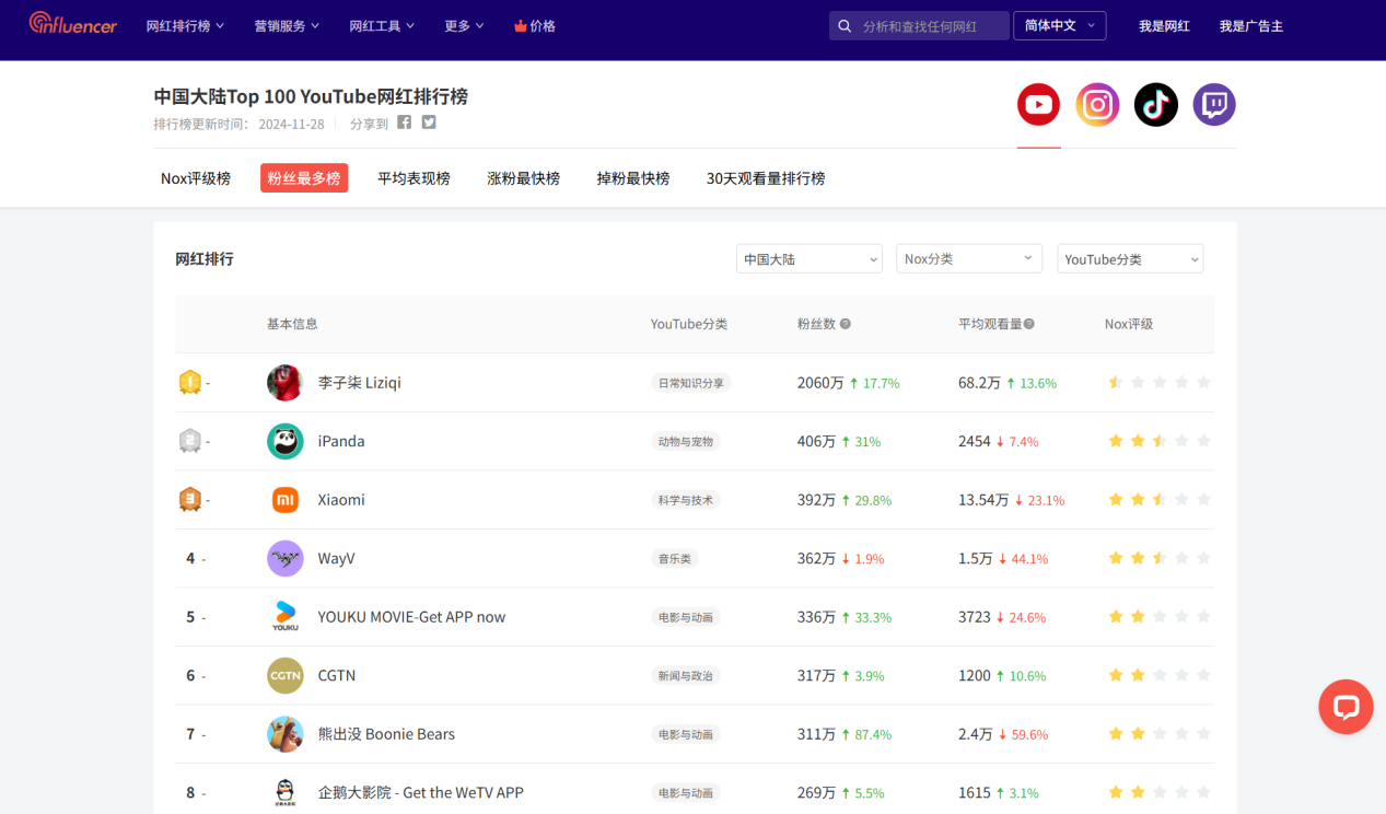 初期选择一个适合的内容方向非常关键。你可以基于自身的特长或兴趣点来确定内容,例如美食、旅游、技术教程等。例如,如果你擅长烹饪,可以做美食教程类视频;如果你是健身达人,可以分享健身经验和训练方法。下图展示了分析工具Influencer上统计的中国YouTuber排名,对于新手寻找方向有所启发。