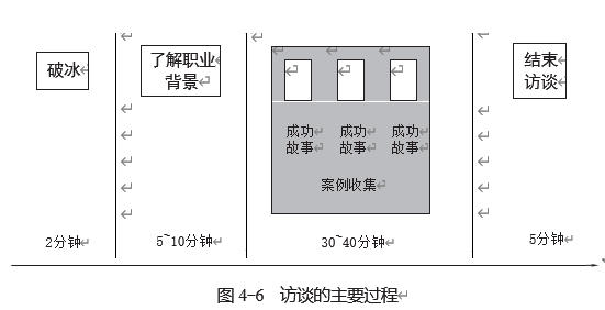 访谈的过程包括破冰、了解职业背景、案例收集、评估、结束访谈。为了获取有价值的行为数据,访谈的整个过程会有一个特定的结构。访谈的总时间在 30 ~ 60 分钟,以 1 小时为例,访谈的主要过程如图 4-6 所示。