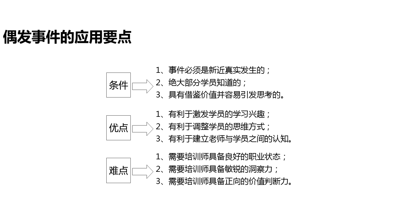 为什么呢?经过与很多学员的交流与分享,作者发现,能够引发他们更多的兴趣,并且真正重视的根本原因在于,在“现场模拟演练”环节中,学员的所有表现都是现场发生的,而且与其本人有直接关联。这种基于现场发生的事情,用在课堂现场的培训方法称之为“偶发事件”。