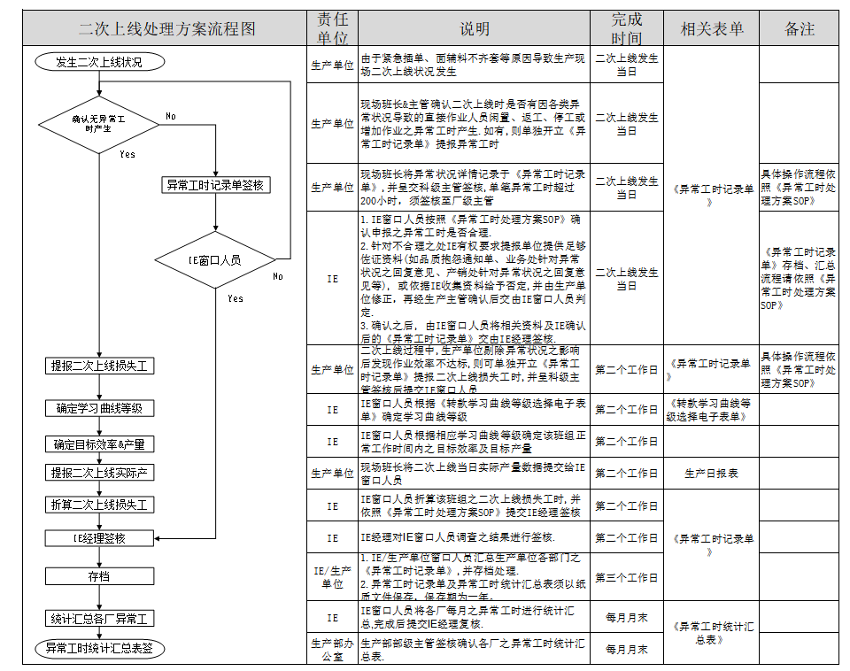 比如上线多少天就算多少天异常,肯定得有一个截点。不能说原先一天做500件,现在做400件,差的100件就算是异常,而应该弄清楚差的这100件是不是在正常的情况下(可能包含其他异常,假如说是因为裁片异常,现场肯定会报裁片异常的异常工时。如果再算二次上线的异常的话。就相当于报了两次异常。)如果是正常情况下,我觉得还是可以参照学习曲线。如学习曲线一共有三个等级。可以将二次上线看作是翻单,计算出其学习曲线等级。