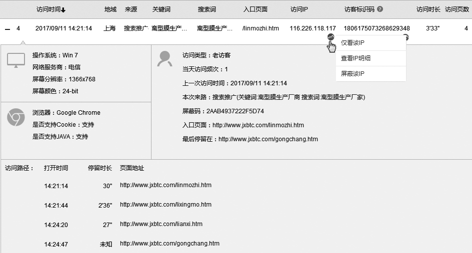 该访客于2017年9月7号通过自然搜索“离型膜生产厂家”,第一次访问网站,看了4页,花了21分40秒;第二次是9月8号通过搜索“离型膜生产”,点击付费搜索推广,看了4页,花了22分6秒;第三次前面已分析。也许有读者会说这三次访问也有可能来自某个竞争对手,他想研究一下你的广告和网站。确实有这个可能,如果该访客这么认真地看过网站还没有咨询,我们肯定会屏蔽掉他,也会怀疑对方是同行。而事实是他在第二次访问时,打电话咨询了我们。是我们是添力公司接到的电话,而不是这家离型膜厂,因为我们为该企业提供了全外包的线上营销服务,有兴趣的读者可以看这家企业的成功案例——本书第八章第六节。