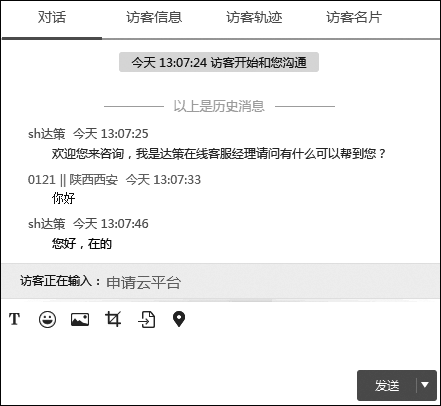注意到图6-5的这几个提示字:“访客正在输入”,也就是说对方只打了“申请云平台”五个字,后面的字还没有打完,甚至是打错了重新输入,在他发送信息前,我们就能看得一清二楚,得以了解客户的真实意图。
