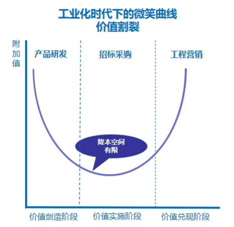 工业化时代的价值创造遵循微笑曲线。如图4-2-1所示,附加值更多体现在上游产品研发和下游品牌销售,处于中间环节的制造附加值最低。采购部门作为工程建设项目全价值链中的关键一环,采购部门为了突显本部门的价值创造,不得不在价格上下功夫以此挖掘降本空间,最终就导致供需双边进入零和博弈的游戏之中。