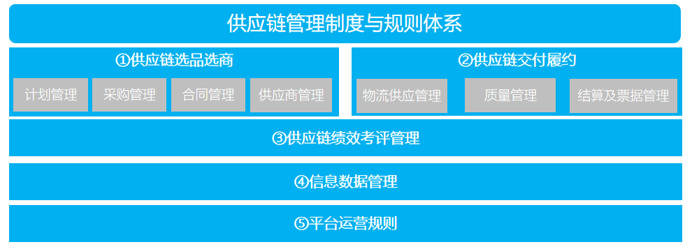 基于前文的制度文件,将其中的业务流程抽离出来作为数字化平台建设的依据以及日常运营的指导,保障平台运营合理合规以及运营流程畅通可落地。另外,前文的制度体系并不能涵盖方方面面,平台运营规则有其特点,因此需要制定平台规则对供应链管理制度进行补充完善。