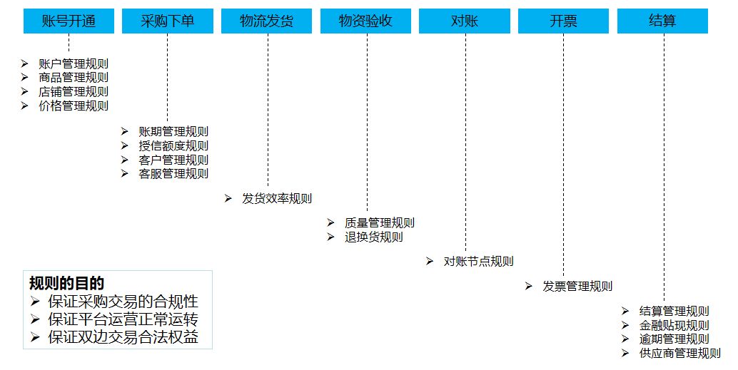 在账号开通环节,包括账户管理规则、商品管理规则、店铺管理规则、价格管理规则;采购下单环节,包括账期管理规则、授信额度规则、客户管理规则、客服管理规则;物流发货环节,包括发货效率规则;物资验收环节,包括质量管理规则、退换货规则;对账环节,包括对账节点规则;开票环节,包括发票管理规则;结算环节,包括结算管理规则、金融贴现规则、逾期管理规则、供应商管理规则等。