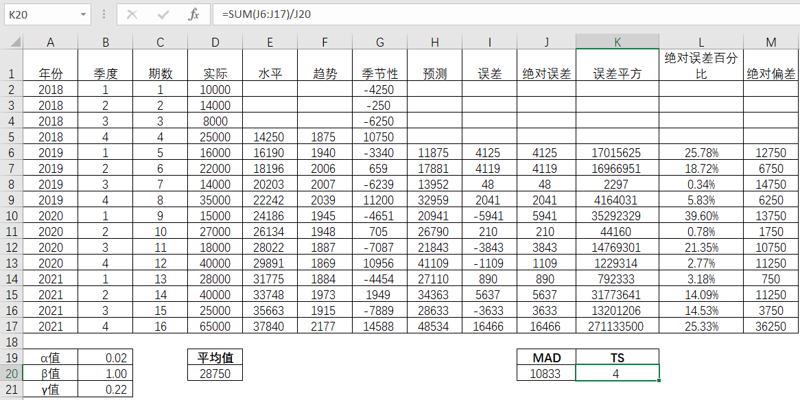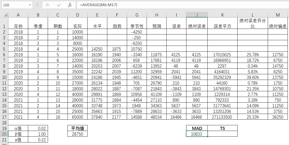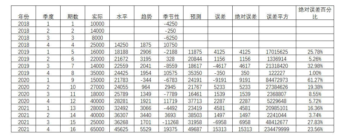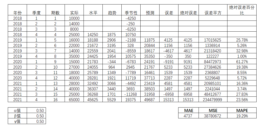 接着对绝对误差,误差平方,绝对误差百分比进行平均,得到对应的平均值,分别是MAE(Mean Absolute Error,平均绝对误差),MSE(Mean Squared Error,平均平方误差)以及MAPE(Mean Absolute Percentage Error, 平均绝对百分比误差)。并且相应的三个参数α,β和γ分别是0.5,0.5和0.5。由此得出的MAE,MSE和MAPE值分别为4737,38780672和19.29%。