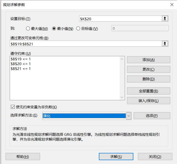 在选择求解方法上,选择优化。求解方法共有三种,分别为非线性GRG,单纯线性规划和演化。单纯线性规划是用于线性问题,在这里并不适合。至于非线性GRG,是常见的非线性规划求解方法,不过得到了局部的最优解,就停止了搜索,继续探究下去。这个最优解可能是全局最优解,也可能不是。因此可能也会出现下图情况,计算到了局部最优解就停止了,而没有继续下去,计算到全局最优解。