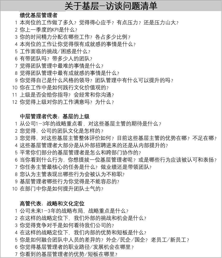 所以,关键事件和关键行为是我们访谈中一定要详细抓取的重要信息。要想获得真实、完整的关键事例,一定要让被访者详尽、完整地描述整个事件及具体的情景与行为。我们以基层管理者的访谈为例,来看具体访谈哪些内容,请看《关于基层-访谈问题清单》。