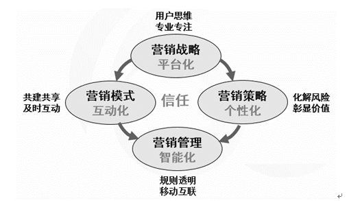 工业营销4.0框架,即营销战略——平台化、营销模式——互动化、营销策略——个性化、营销管理——智能化,信任是其核心,如下图所示。